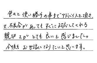 色々と使い勝手の事までアドバイスを頂き、又、不具合があっても、すぐに対応してくれる親切さが、とても良いと感じました。今後もお世話になりたいと思います。