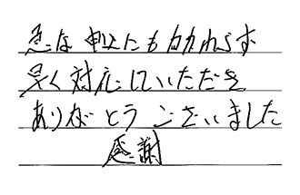 急な申込にもかかわらず、早く対応していただき、ありがとうございました。感謝。
