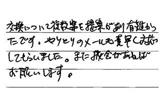 交換について、複数案の提案があり、有難かったです。やりとりのメールも素早く対応してもらいました。また機会があれば、お願いします。