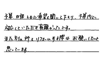 予算、日程ともに希望を聞いて下さり、予算内で対応していただき、有難かったです。また別の所をリフォームする際は、お願いしたいと思っています。