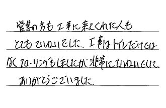営業の方も工事に来てくれた人も、とてもていねいでした。工事はトイレだけではなく、フローリングもしましたが、非常にていねいでした。ありがとうございました。
