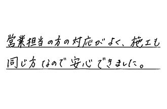 営業担当の方の対応がよく、施工も同じ方なので、安心できました。