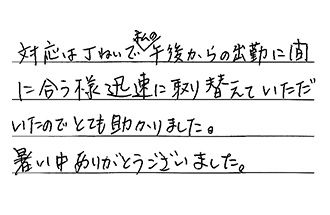 対応はていねいで、私の午後からの出勤に間に合う様、迅速に取り替えていただいたので、とても助かりました。暑い中、ありがとうございました。