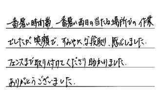 一番暑い時間帯、一番暑い西日の当たる場所での作業でしたが、笑顔で、すみやかな段取り、感心しました。フェンスまで取り付けてくださり、助かりました。ありがとうございました。