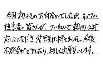 今回初めてのお付合いでしたが、ずべての担当者の皆さんが、ていねいで親切に対応していただき、信頼が持てました。今後不都合がでましたら、よろしくお願いします。