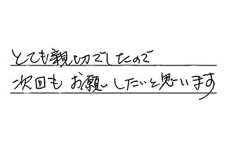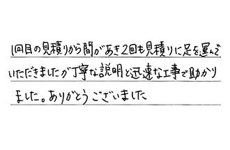 1回目の見積りから間があき、2回も見積りに足を運んでいただきましたが、丁寧な説明と迅速な工事で助かりました。ありがとうございました。