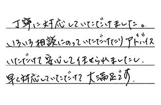 丁寧に対応していただけました。いろいろ相談にのっていただけたり、アドバイスいただけて、安心して任せられましたし、早く対応していただけて、大満足です。