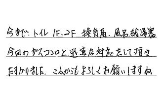 今まで、トイレ1F・2F、換気扇、風呂給湯器、今回のガスコンロと、迅速な対応をして頂き、たすかりました。これからもよろしくお願いしますね。