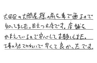 大田区の大問屋様の前を車で通るので、知ってました。目立つお店です。店舗をかまえているので、安心してお願いしました。工事の方もていねいで、早くて良かったです。