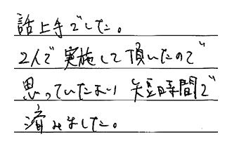 受付時、電話対応の方も親切ていねいでしたし、工事の方も感じ良く、汗びっしょりで一生けんめい行って下さいましたので、感謝しております。次の工事でも、又、お願いしたいと思います。