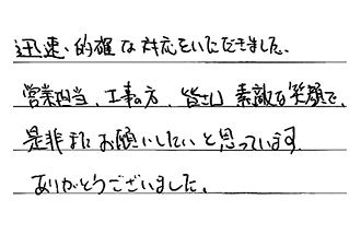 迅速・的確な対応をしていただきました。営業担当、工事の方、皆さん素敵な笑顔で、是非またお願いしたいと思っています。ありがとうございました。