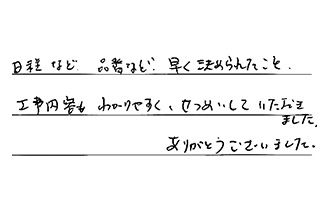 日程など、品番など、早く決められたこと。工事内容もわかりやすく、せつめいしていただきました。ありがとうございました。