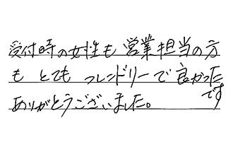 受付時の女性も、営業担当の方も、とてもフレンドリーで良かったです。ありがとうございました。