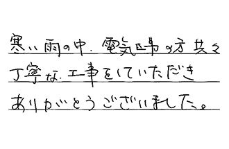 寒い雨の中、電気工事の方共々、丁寧な工事をしていただき、ありがとうございました。