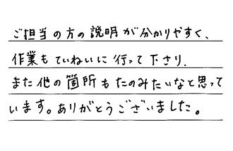 ご担当の方の説明が分かりやすく、作業もていねいに行って下さり、また他の箇所もたのみたいなと思っています。ありがとうございました。