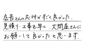 店長さんの応対がすごく良かった。見積り・工事も早く、大問屋さんにお願いして良かったと思います。