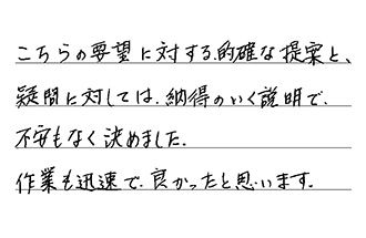 こちらの要望に対する的確な提案と、疑問に対しては、納得のいく説明で、不安もなく決めました。作業も迅速で、良かったと思います。