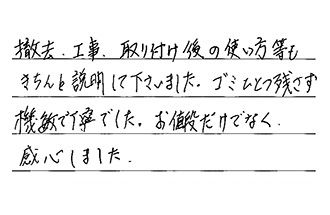 撤去、工事、取り付け後の使い方等も、きちんと説明して下さいました。ゴミひとつ残さず、機敏で丁寧でした。お値段だけでなく、感心しました。