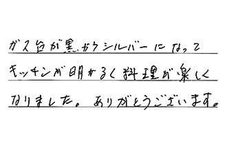 ガス台が黒かシルバーになって、キッチンが明るく、料理が楽しくなりました。ありがとうございます。