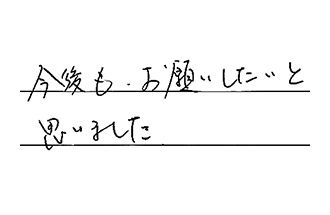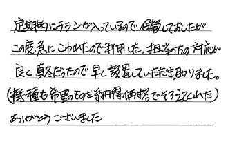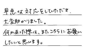 早急な対応をしていただき、大変助かりました。何かあった際は、またこちらにお願いしたいと思います。
