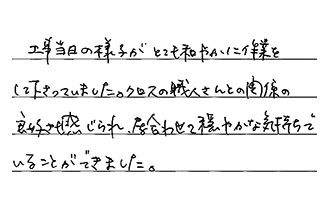 (営業)工事担当の方が、とても早く丁寧に作業され、たすかりました。また何かの機会には、ご相談に行きます。