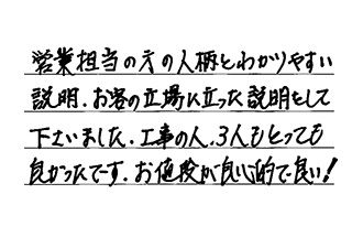 営業担当の方の人柄とわかりやすい説明、お客の立場に立った説明をして下さいました。工事の人、3人もとっても良かったです。お値段が良心的で良い!