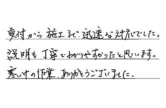 受付から施工まで、迅速な対応でした。説明も丁寧でわかりやすかったと思います。寒い中の作業、ありがとうございました。