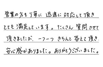 営業の方も丁寧に迅速に対応して頂き、とても満足しています。たくさん質問させて頂きましたが、一つ一つきちんと答えて頂き、安心感がありました。ありがとうございました。