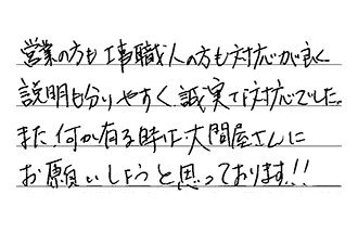 営業の方も工事職人の方も対応が良く、説明も分りやすく、誠実な対応でした。また、何か有る時は、大問屋さんにお願いしようと思っております!