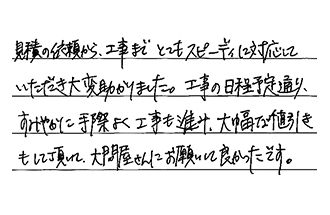 前回もそうですが、工事職人さんが良く、気くばりや対応が貴社の教育が徹底していると感じました。今後も宜しくお願いいたします。