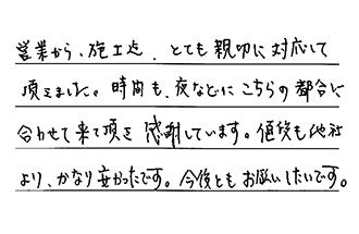 営業から施工迄、とても親切に対応して頂きました。時間も、夜などにこちらの都合に合わせて来て頂き、感謝しています。値段も他社よりかなり安かったです。今後ともお願いしたいです。