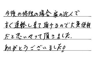 今後の修理の場合、家の近くですぐ連絡し来て頂けるので、大変便利だと思い、やって頂きました。ありがとうございました!