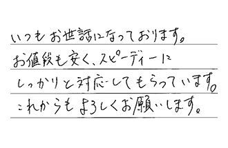 いつもお世話になっております。お値段も安く、スピーディーにしっかりと対応してもらっています。これからもよろしくお願いします。