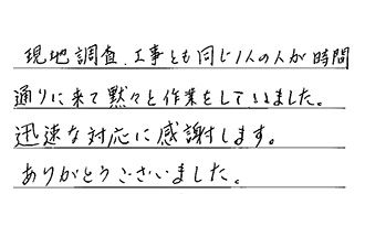 現地調査、工事とも同じ1人の人が時間通りに来て、黙々と作業をしていました。迅速な対応に感謝します。ありがとうございました。