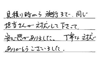 見積り時から施工まで、同じ担当さんが対応して下さって、安心感がありました。丁寧な対応、ありがとうございました。