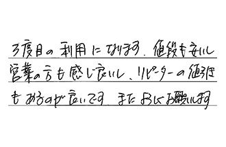 3度目の利用になります。値段も安いし、営業の方も感じ良いし、リピーターの値引きもあるのが良いです。またよろしくお願いします。