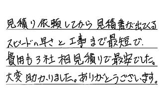 見積り依頼してから、見積書が出てくるスピードの早さと工事まで最短で、費用も3社相見積りで最安でした。大変助かりました。ありがとうございます。