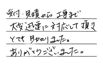 受付・見積から工事まで、大変迅速に対応して頂き、とても助かりました。ありがとうございました。