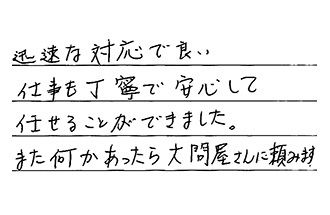 迅速な対応で良い。仕事も丁寧で、安心して任せることができました。また何かあったら、大問屋さんに頼みます。