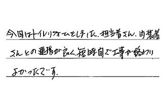 今回はトイレリフォームをしました。担当者さん、内装者さんとの連携が良く、短時間で工事が終わり、よかったです。