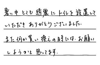 暑い中、とても綺麗にトイレを設置していただき、ありがとうございました。また何か買い換えの時には、お願いしようかと思ってます。