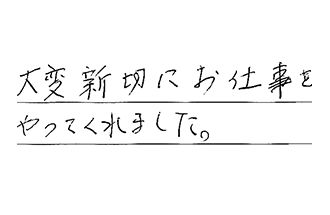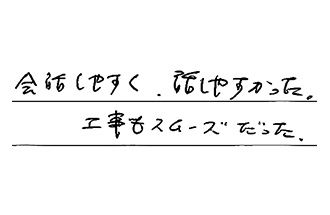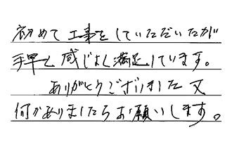 初めて工事をしていただいたが、手早く感じよく満足しています。ありがとうございました。又、何かありましたら、お願いします。