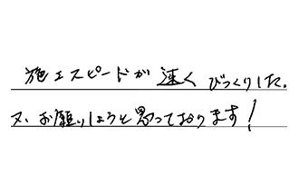 文句のつけようが無いくらい、最高の施工でした。担当の方の説明もわかりやすく、プロフェッショナルだと感じました。何かあったら、迷わず大問屋さんにお願いします!