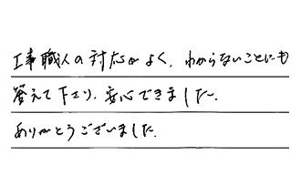 工事職人の対応がよく、わからないことにも答えて下さり、安心できました。ありがとうございました。