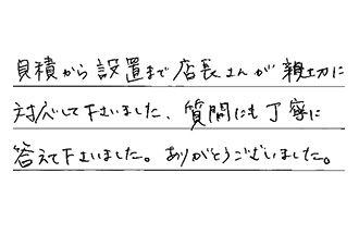見積から設置まで、店長さんが親切に対応して下さいました。質問にも丁寧に答えて下さいました。ありがとうございました。