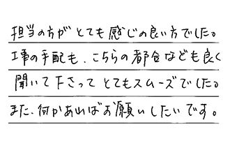 担当の方がとても感じの良い方でした。工事の手配も、こちらの都合なども良く聞いて下さって、とてもスムーズでした。また何かあれば、お願いしたいです。