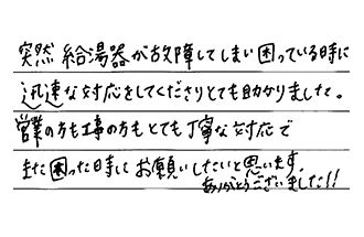 突然給湯器が故障してしまい、困っている時に、迅速な対応をしてくださり、とても助かりました。営業の方も工事の方も、とても丁寧な対応で、また困った時に、お願いしたいと思います。ありがとうございました!