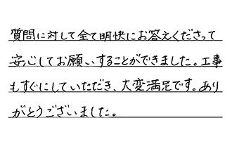 質問に対して全て明快にお答えくださって、安心してお願いすることができました。工事もすぐにしていただき、大変満足です。ありがとうございました。