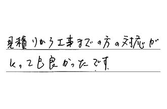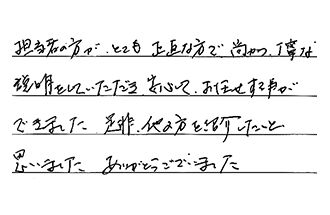 担当者の方が、とても正直な方で、尚かつ丁寧な説明をしていただき、安心してお任せする事ができました。是非、他の方を紹介したいと思いました。ありがとうございました。