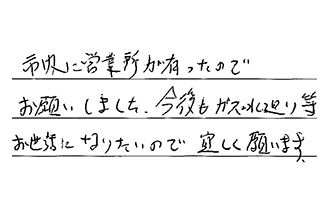 市内に営業所が有ったので、お願いしました。今後もガス・水廻り等、お世話になりたいので、宜しく願います。